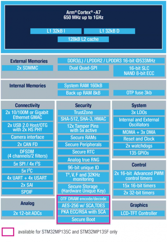 – 多种基于硬件的安全和加密功能,包括 AES 128-256, PKA ECC/RSA, DPA,