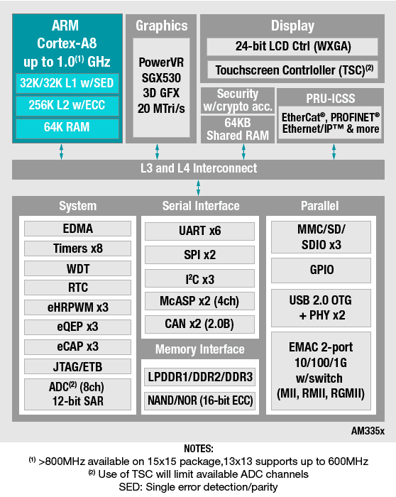 德州仪器的 AM335x 系列处理器可提供高达 1 GHz 的处理性能,支持PowerVR SGX™图形加速器子系统,提供优异的 3D 图形加速功能易于实现增强型的人机交互界面,也提供工业以太网等特性支持以及丰富的外设。