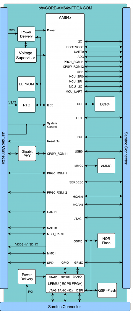 phyCORE-AM64x-FPGA 是一款稳健可靠的无显示嵌入式解决方案,特别适用于实时的工业系统。这款 70mm x 39mm 的核心板具有高达 400 个引脚,支持 CAN、EtherCAT®、UART、I2C、ePWM、eCAP、eQEP 等接口,同时还配有 92 个通用 FPGA-I/O 接口。由于 TI AM64x 处理器和 Lattice ECP5 FPGA的异构架构,您可以在 Linux 下运行大部分应用程序,而将时间敏感程序组件的交给低延迟的专用实时核进行处理,或者在 FPGA 中执行。